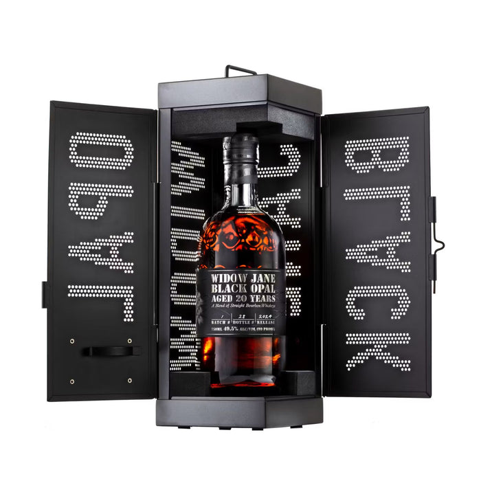 Naast de uitzonderlijke smaakervaring biedt Black Opal ook een visuele beleving. Elke fles is verpakt in een zware stalen geschenkdoos met het kenmerkende Widow Jane-logo. Het glas zelf is voorzien van een subtiele juweelstructuur die zichtbaar wordt naarmate je meer drinkt. De fles wordt afgesloten met een verzwaarde metalen dop, en elk exemplaar bevat een gelimiteerde kunstfoto uit de distilleerderij – handgenummerd en gesigneerd door de fotograaf.